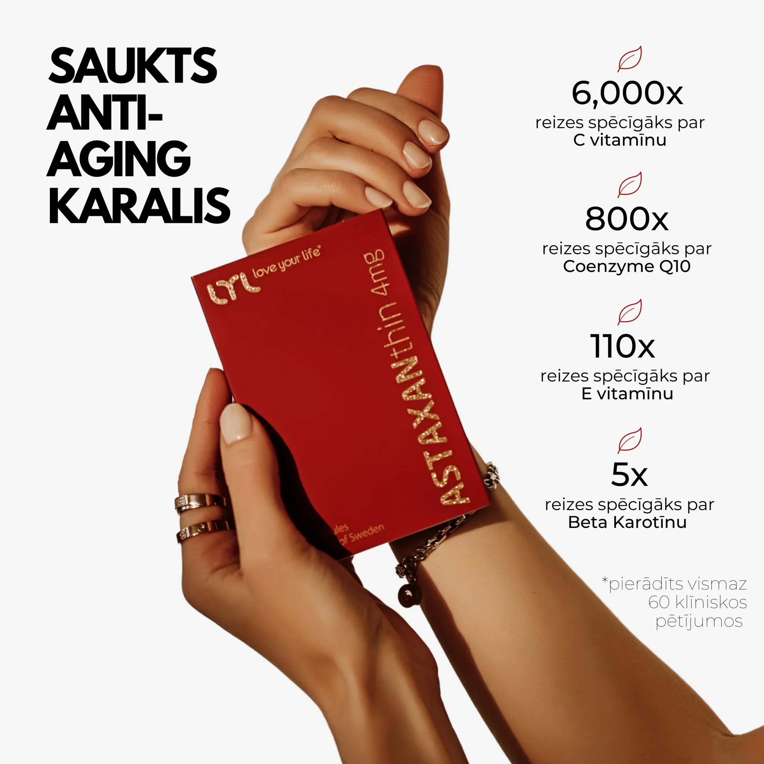 Atjauno bojātās šūnas: no visām dabā zināmajām pretnovecošanās molekulām astaksantīns visspēcīgāk attīra šūnas no brīvo radikāļu izraisītiem bojājumiem, kuri ir tieši atbildīgi par ādas novecošanos